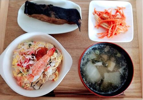 母の残り物のちらし寿司 作り置きの人参ナムル 黒がれいの煮付け(レトルト) 豆腐とわかめ入り、残り物野菜の和風味スープ 母は決まった物しか食べないし、私ひとり分を作るのも面倒で、食生活が残り物オンパレードになってる。 残り物がない日もある。 も…