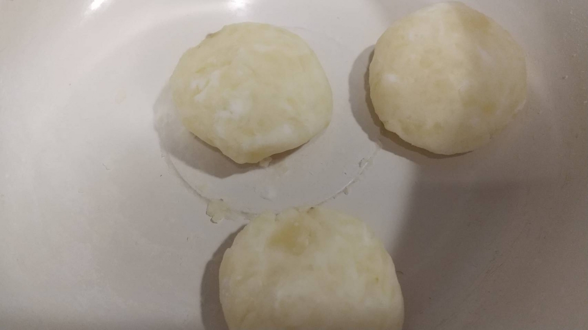 - つぶしたじゃがいもに片栗粉、牛乳を加えて混ぜ、食べやすい大きさに平たい円形に形作る。
