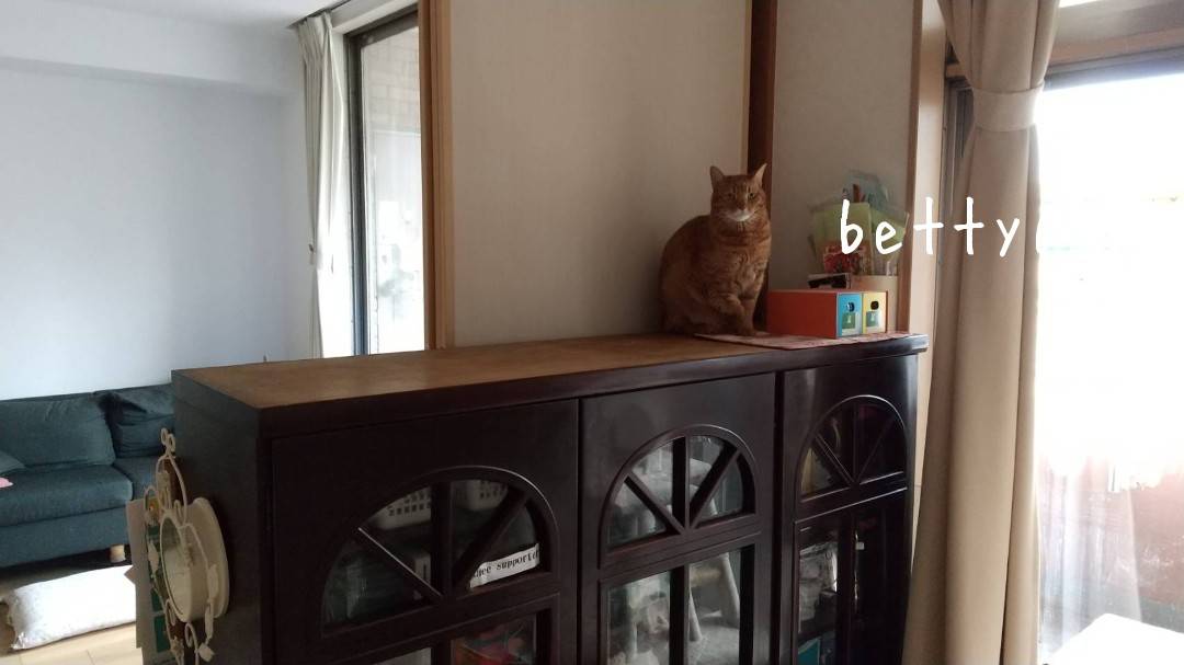 なので、戸棚の上を片づけたら、すぐにそれを目ざとくみつける猫さん。