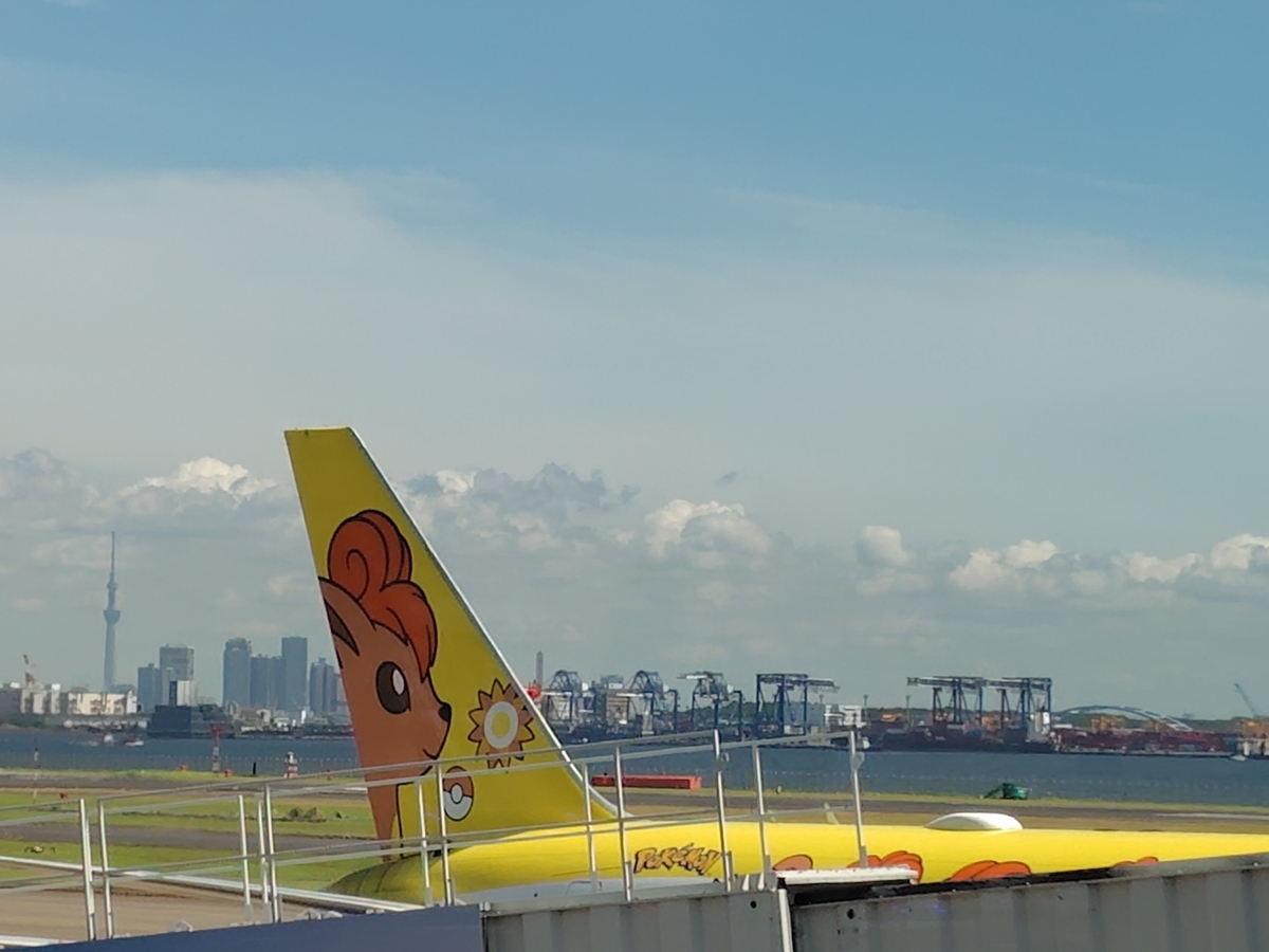 乗った飛行機は、ポケモンのラッピング飛行機だったよ。