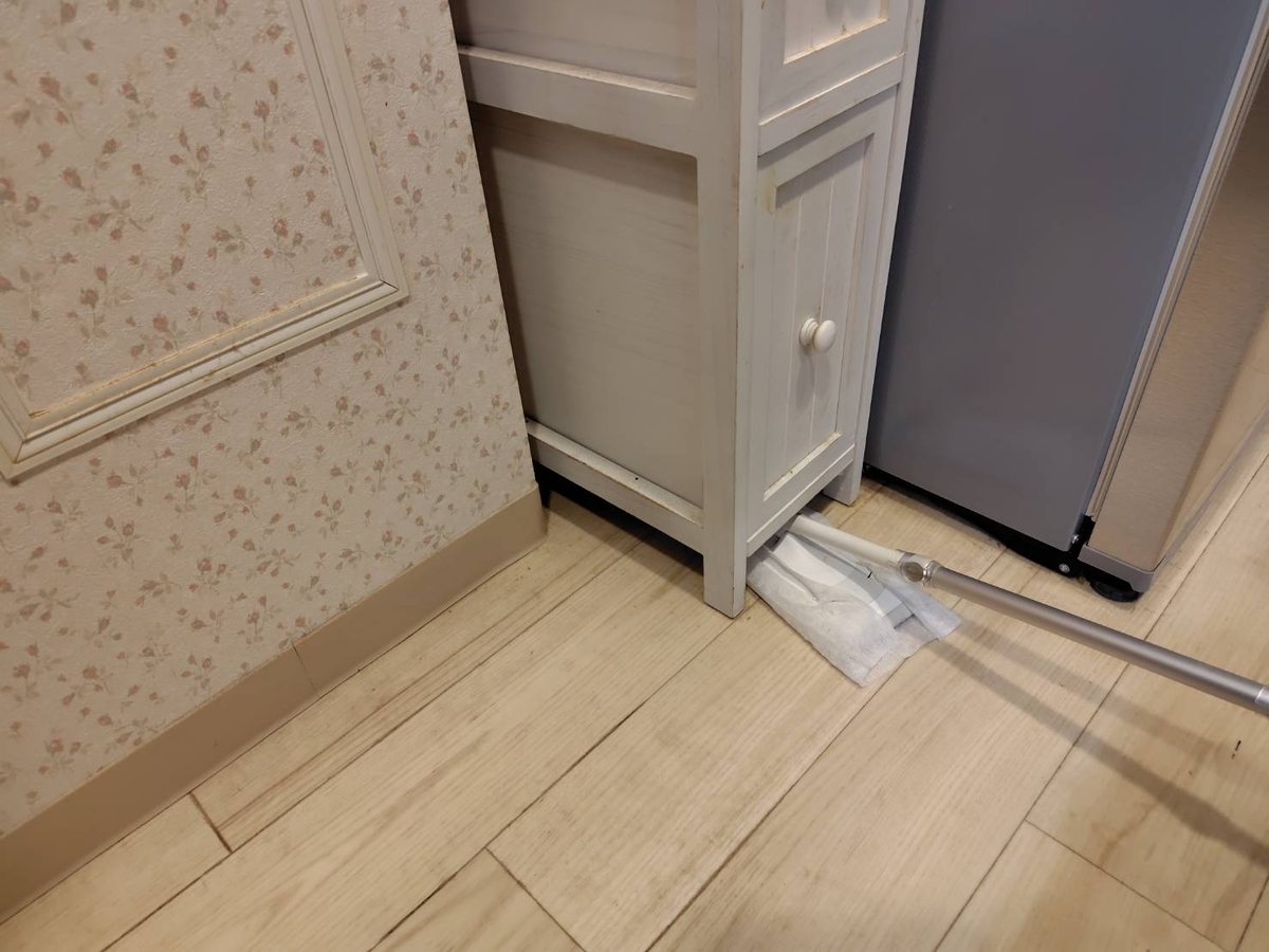 となりのスリム棚の下にはクィックルワイパーがすっぽり入るので、動かさなくても掃除できます。